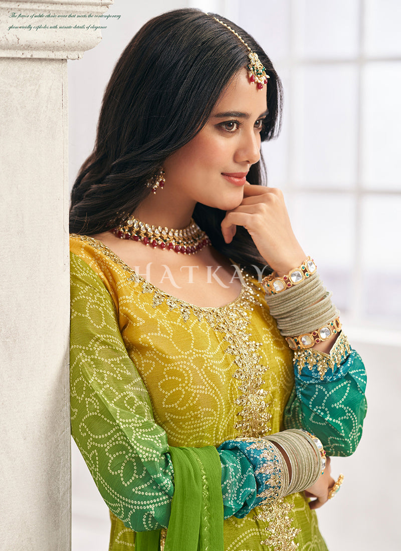 Green Yellow Ombre Palazzo Suit is meticulously designed for the festive season, featuring intricate handwork embroidery on a straight cut digital printed chinnon silk fabric. The top is adorned with golden reshamkari zari, mirror and sequins work, and is paired with heavy ghera embellished flared premium chinnon sharara bottom. This ensemble is completed with a zari tassel lace enhanced chinnon silk dupatta. Elevate your look for weddings or festive occasions with studded earrings and chic heels.