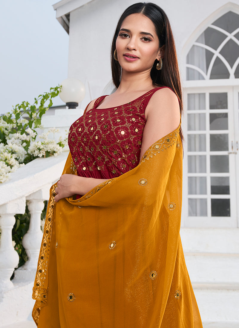 Deep Red Embroidery High Slit Anarkali Suit