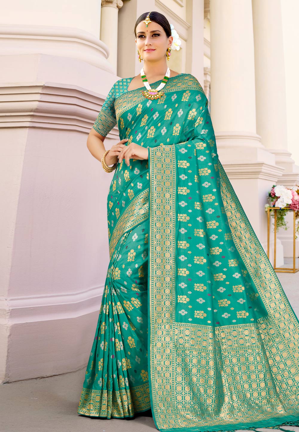 Aqua Blue Indian Banarasi Silk Saree in USA, UK, Canada and Worldwide. Shop Latest Indian Saree Collection Of Aqua Blue Indian Banarasi Silk Saree Online In Australia, New Zealand Indian wear with elegance and vibrant appealing with all the hues of zari brocade work that has traditional floral touch embedded perfectly with tassels details over pallu on banarasi silk with matching equally embellished raw silk blouse. Drape this saree on festive parties or on wedding event with heels and statement jewelry to look like a diva.