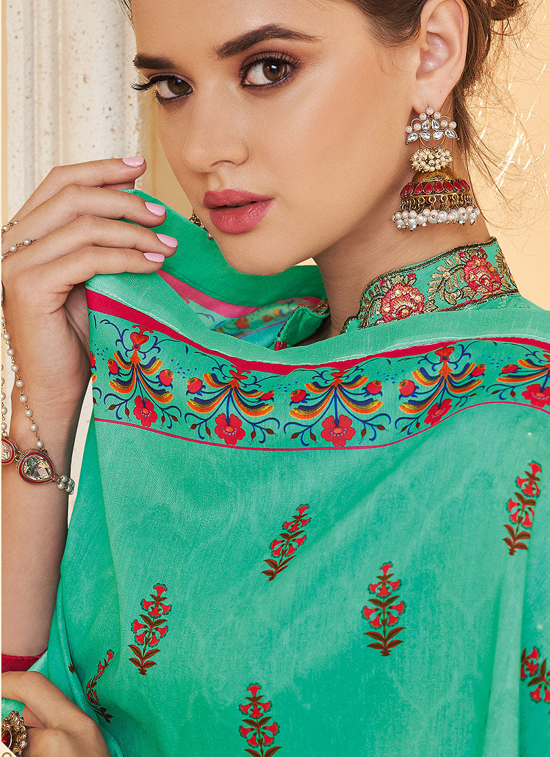 Aqua Blue Designer Pant Suit In usa uk canada. Shop Latest Indian Clothes Collection Of Aqua Blue Designer Pant Suit Online In Australia, Newzeland. This set has all the traditional hues of hand work done with multi colour thread embroidery on its faux georgette top paired with santoon bottom and inner. The unique part is it’s digital printed muslin dupatta. Wear this with a pair of heels and traditional jewellery to have a desi girl look.