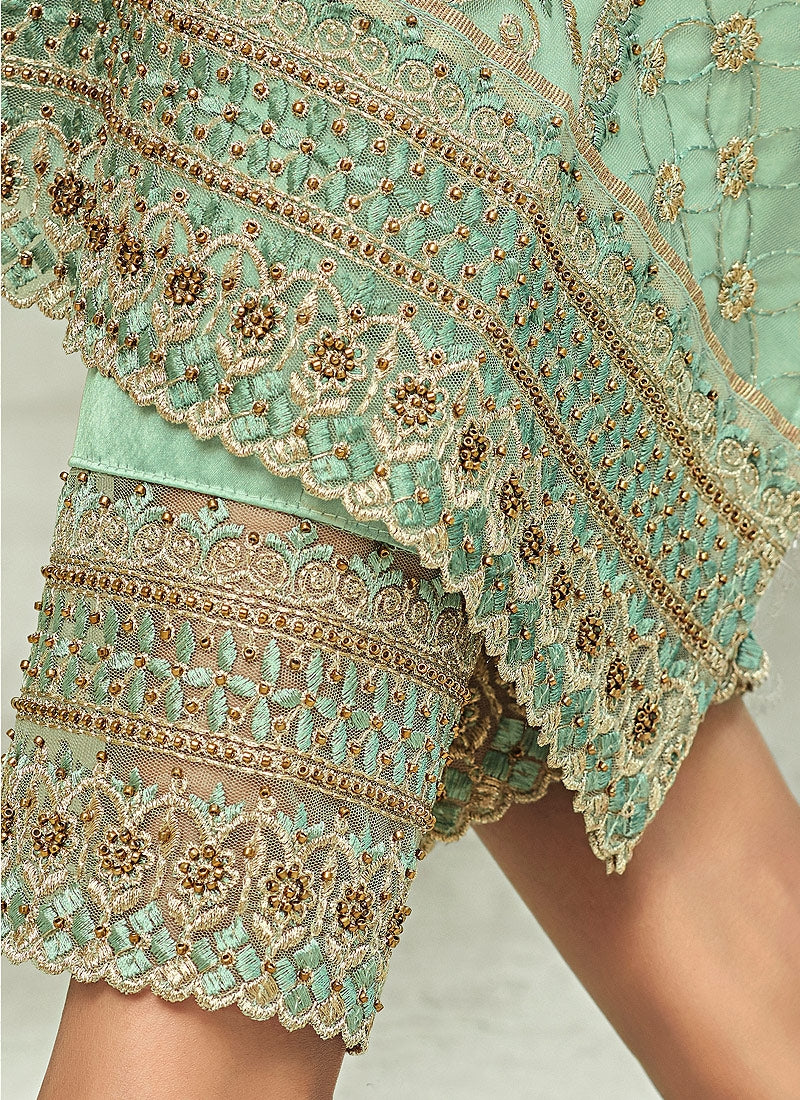 Aqua Blue Pakistani Embroidered Pant Suit
