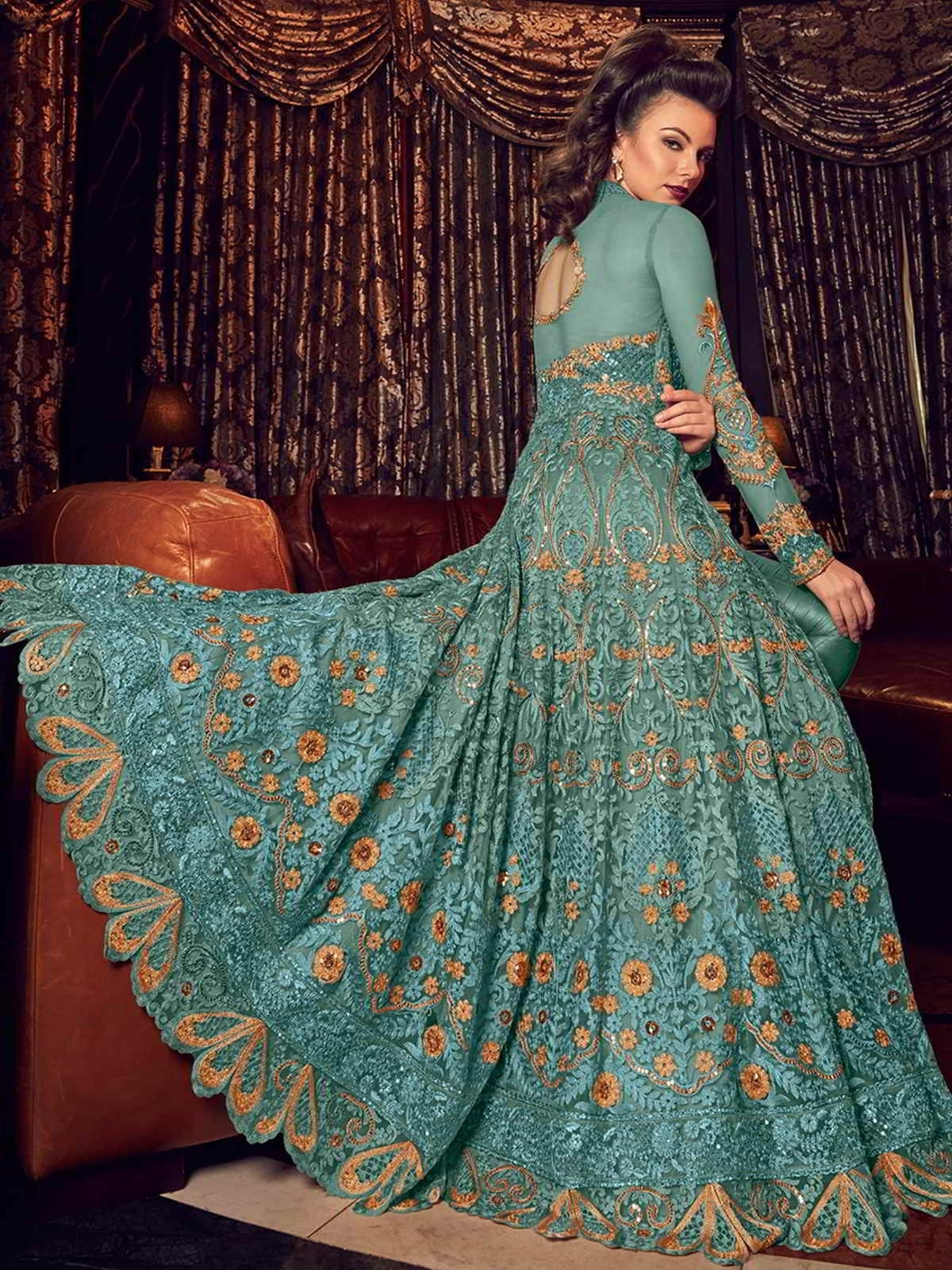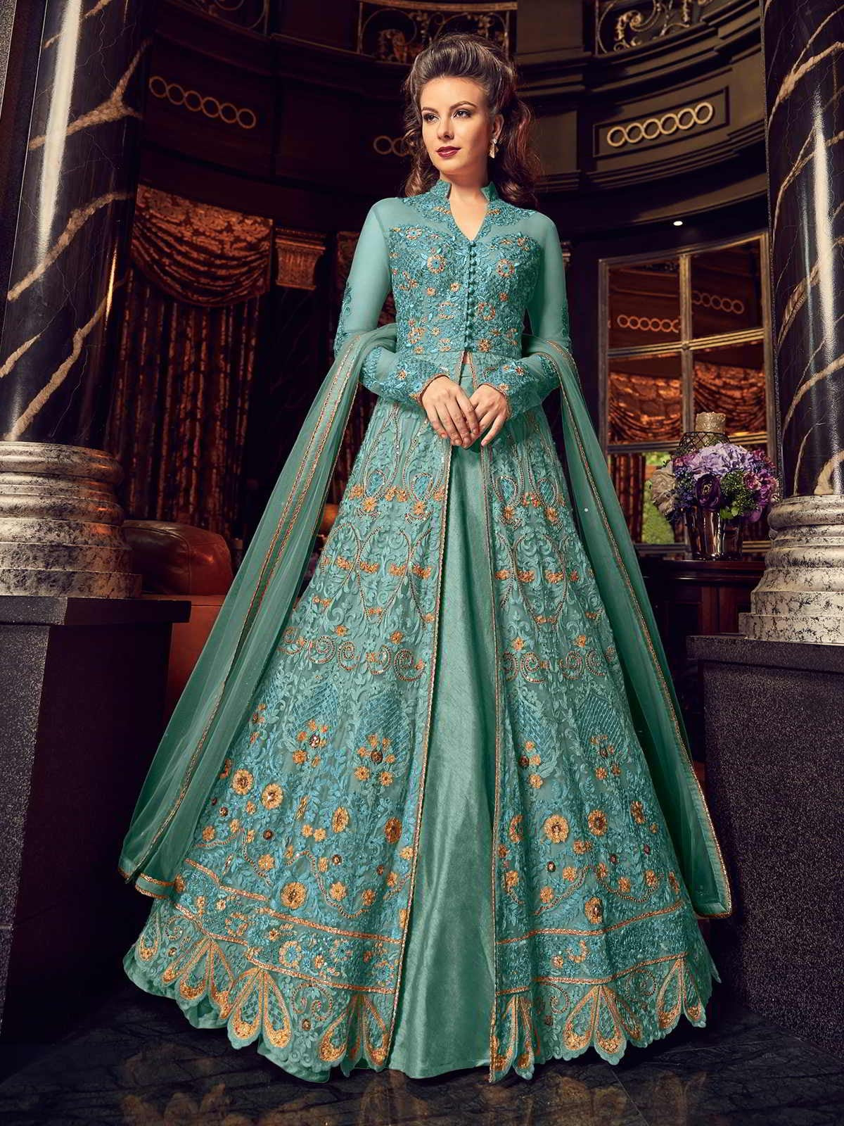 Aqua Blue With Golden Embroidered Lehenga/Pant Suit features embroidery work with minimalist modern art detail annotated beautifully with the combination of resham zari, thread and stone work on its flared anarkali net top paired with matching bangalori silk lehenga/pant bottom and inner and border detailed net bordered dupatta. Style this very pretty attire on any wedding or festival party with heels and jewellery to look stunningly beautiful from the rest of the crowd.
