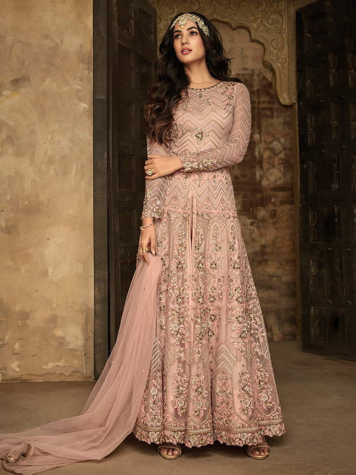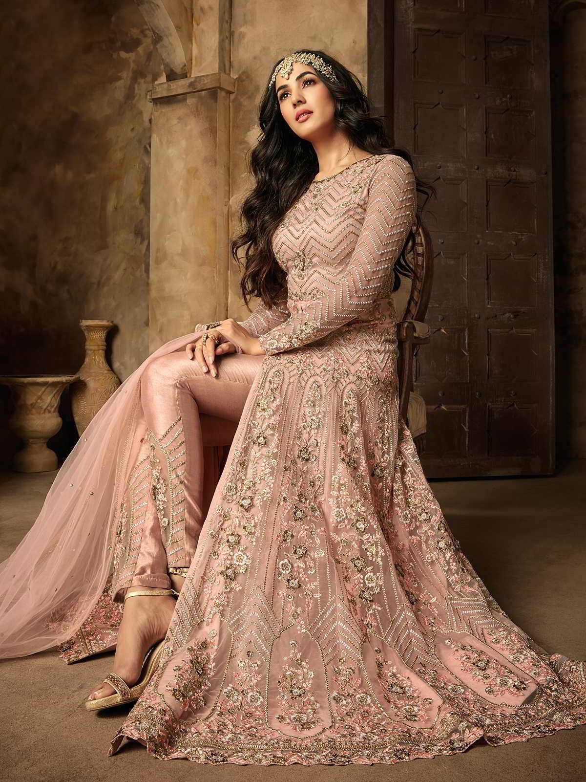 Baby Pink Ethnic Embroidered Pakistani Style Pant Suit features embroidery work with minimalist modern art detail annotated beautifully with the combination of resham zari, thread and stone work on its flared anarkali net top paired with matching santoon pants bottom and inner and embellished net bordered dupatta. Style this very pretty attire on any wedding or festival party with heels and jewellery to look stunningly beautiful from the rest of the crowd.
