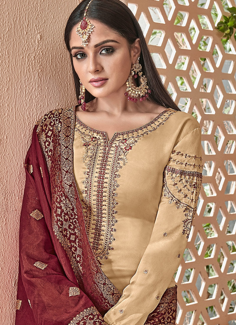 Beige And Maroon Combination Embroidered Palazzo Suit is specifically designed to make you look perfect for wedding event or any festive occasions. This elegant set comprises a georgette satin kurta with neckline and sleeves detailed with minimal traditional motifs of digital zari and thread embroidery paired with santoon bottom, lining and an extraordinary banarasi jacquard dupatta. Team this suit with golden heels and matching accessories to have a graceful look.