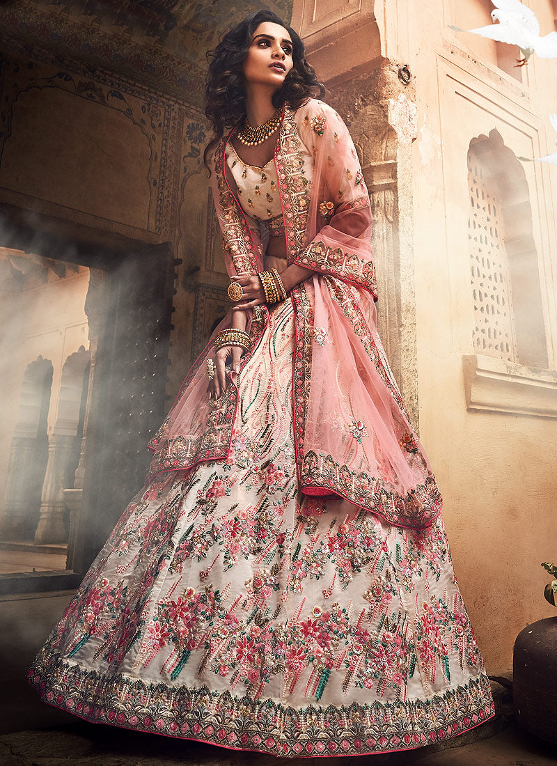 Beige And Pink Designers Lehenga Choli In usa uk canada. Shop Latest Indian Clothes Collection Of Beige And Pink Designers Lehenga Choli Online In Australia, Newzeland. This set comprises of traditional zari, zarkan and resham-kari embroidered organza silk choli paired with all over embroidered organza silk lehenga with satin inner and minimalist embroidered soft net dupatta. Style this set with heels and golden jewellery to look stunning with all bridal drama.
