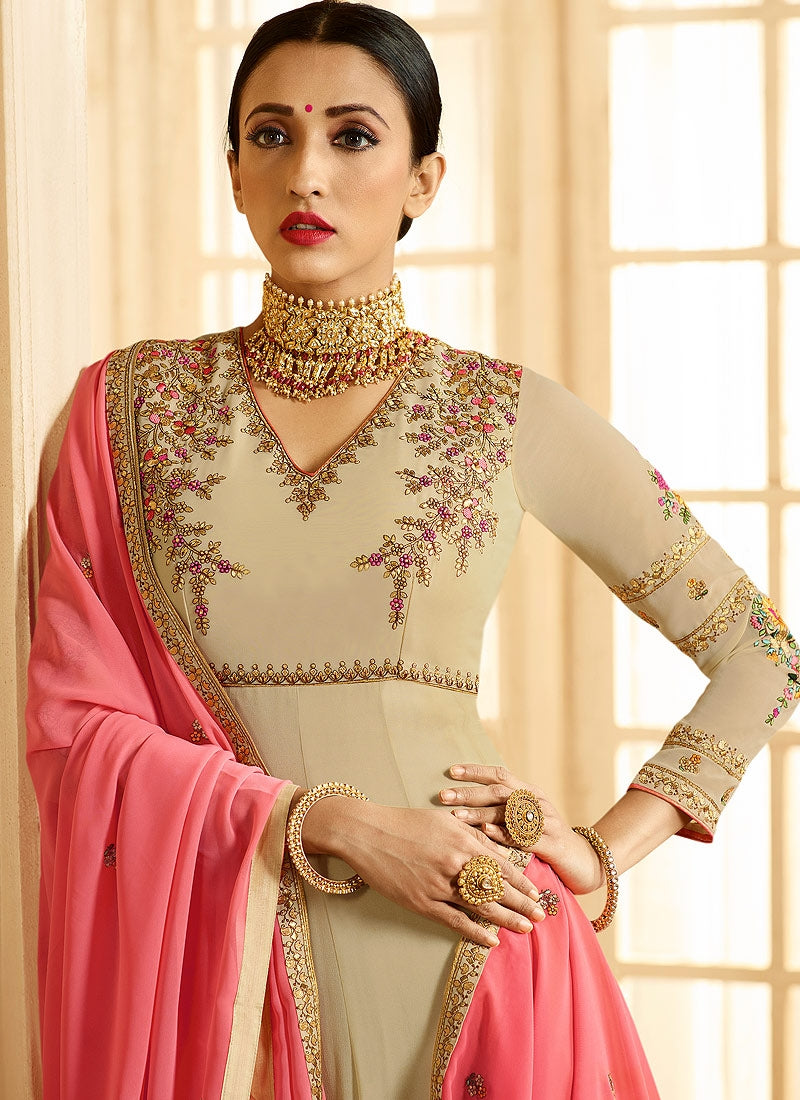 Beige And Pink Ethnic Embroidered Flared Anarkali Suit