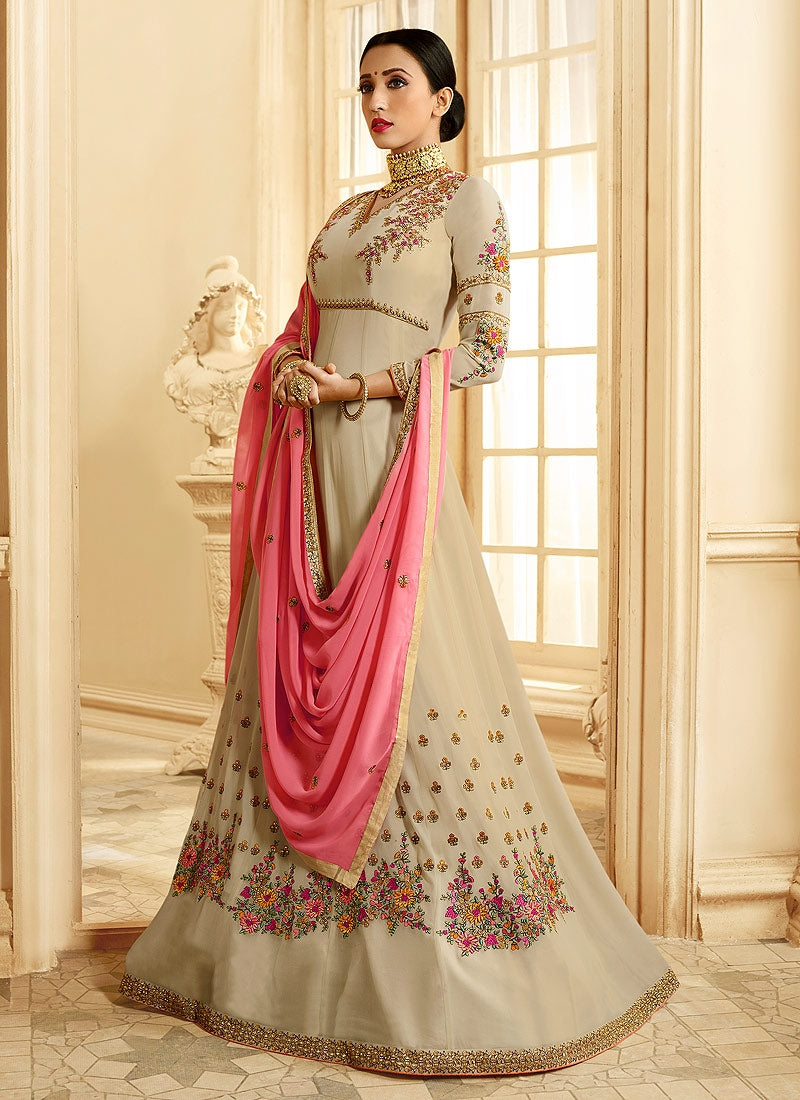 Beige And Pink Ethnic Embroidered Flared Anarkali Suit is especially crafted for showcasing glamorous style and ethnic elegance with its unique embroidered combination of zari and resham thread work annotated perfectly on flared georgette top with satin layered lining. This set accompanies with matching santoon bottom and bordered nazmine chiffon dupatta. Style it gracefully with studded earrings and stylish heels.