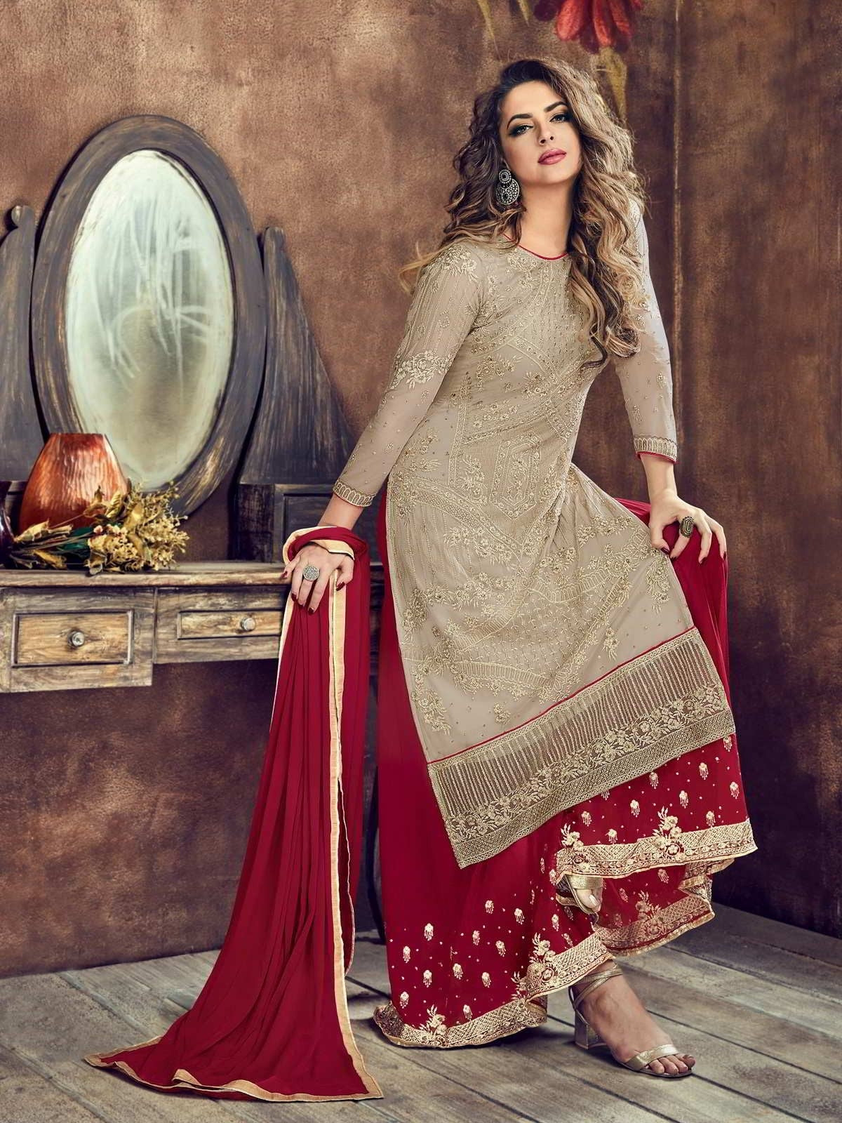 Beige And Red Embroidered Flared Palazzo Suit shows combination of embossed zari and thread embedded designer embroidery on heavy net fabric top with minimalist detail paired with designer net and japan satin palazzo pants and lining and classic bordered chiffon dupatta. Alluring beauty of this dress will make you look classy and stylish when styled with stilettos and clutch.
