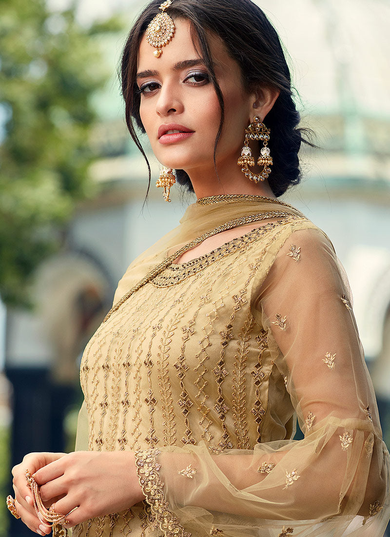 Beige Golden Designer Gharara Suit In usa uk canada. Shop Latest Indian Clothes Collection Of Beige Golden Designer Gharara Suit Online In Australia, Newzeland. This suit set comprises a beautiful traditional zari, sequence and thread embroidered straight cut net with santoon lining top paired with net embellished gharara bottom and shimmering lace bordered net dupatta. This suit set will go well with golden jewellery and heels.