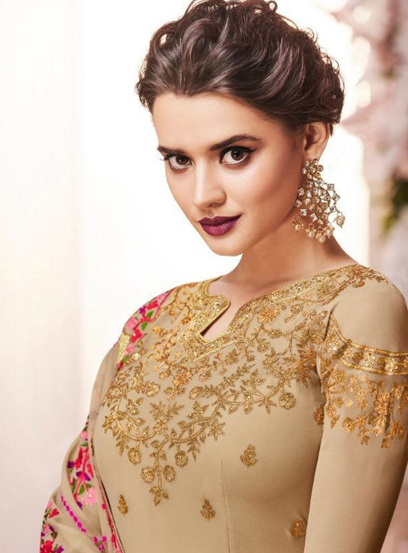 Beige Golden Multi Embroidered Flared Anarkali Suit features embroidery work with minimalist modern art detail annotated beautifully with the combination of resham zari, thread and stone work on its flared anarkali georgette top paired with matching santoon pant bottom and santoon inner and detail embroidered georgette dupatta. Style this very pretty attire on any wedding or festival party with heels and jewellery to look stunningly beautiful from the rest of the crowd.
