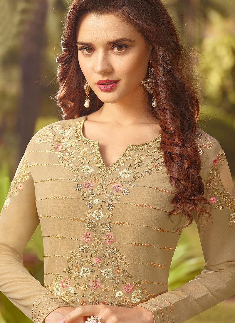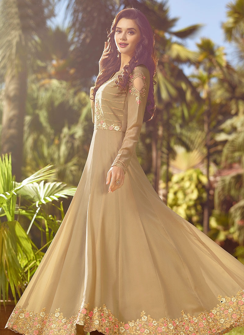 Beige With Multicoloured Embroidery Plaited Anarkali Suit