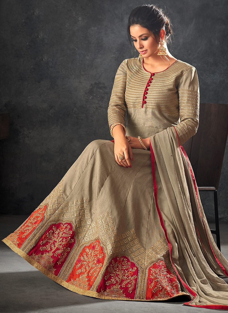 Beige With Red Touch Minimalist Embroidered Flared Anarkali Suit is specifically designed to make you look perfect for wedding event or any festive occasions. This suit set features floral embroidery work of zari and resham thread embroidered on fancy raw silk top with fussing santoon inner detail paired with santoon bottom and butti detailed chiffon dupatta. Team this suit with stilettos and statement jewellery to complete your look.