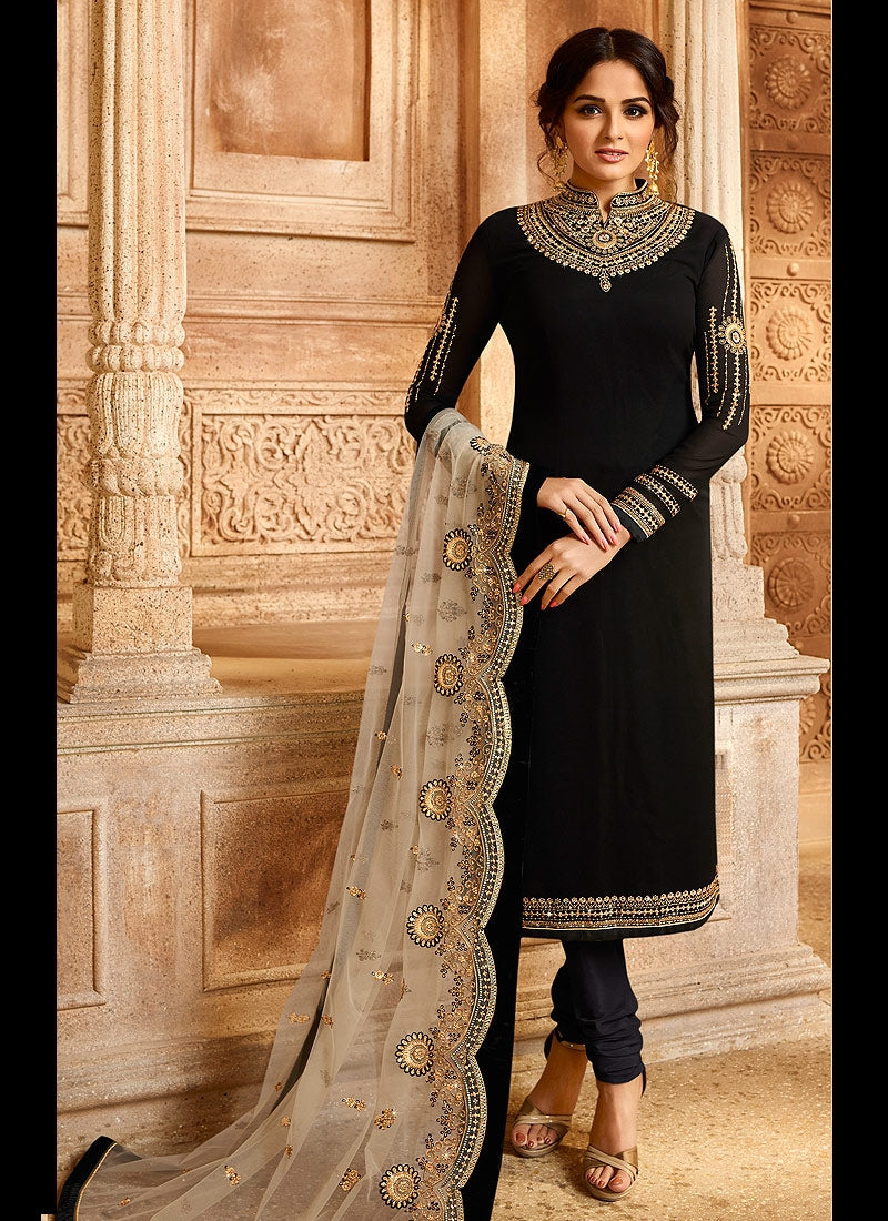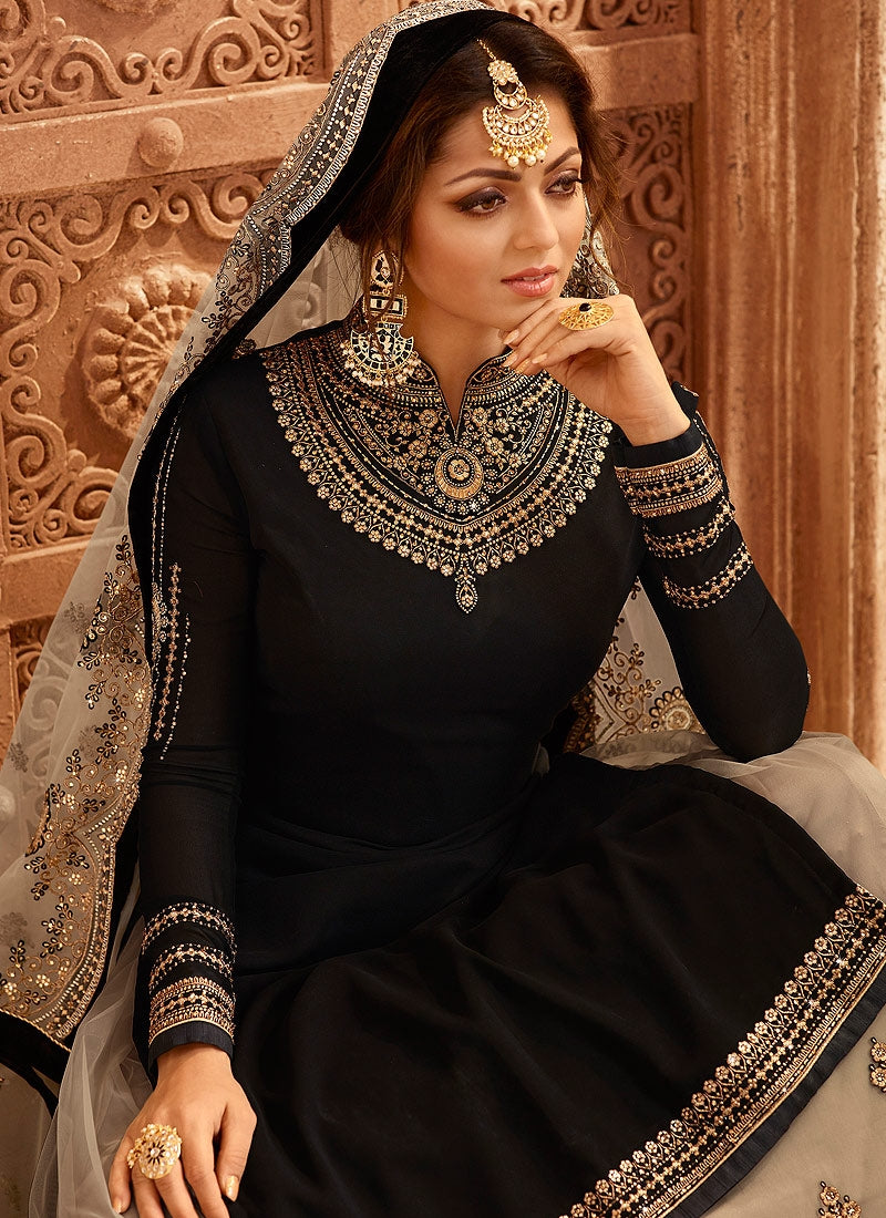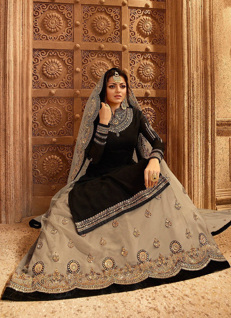 Black And Beige Dual Bottom Lehenga/Pant Kurti Set is especially crafted for showcasing glamorous style and ethnic elegance with its unique embroidered combination of zari and resham thread work annotated perfectly on straight cut satin georgette top with santoon lining and flared georgette layered embroidered lehengha. This set also accompanies with matching santoon pant bottom and embroidered cut work net dupatta. Style it gracefully with studded earrings and stylish heels.