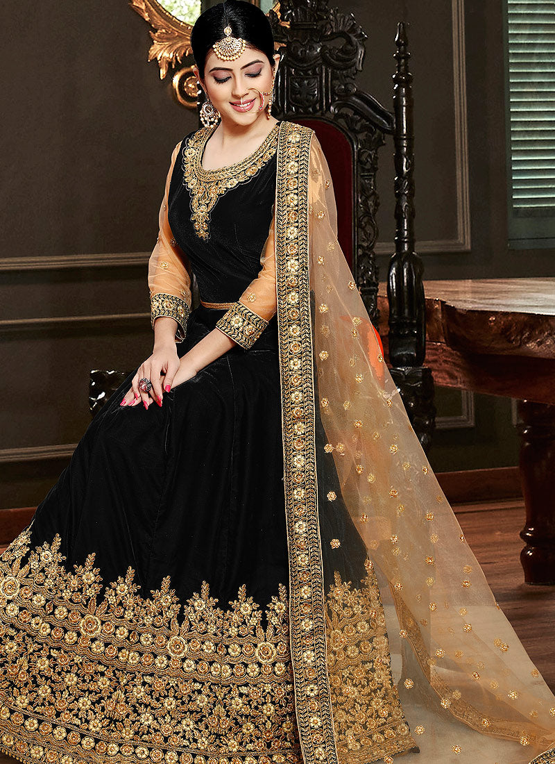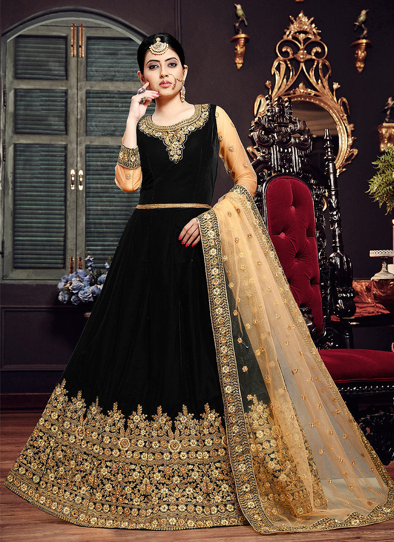 Black And Golden Embroidered Velvet Anarkali Suit is designed with absolute perfection to rock any festive occasion or wedding parties. This set features intricate embroidery work with zari, thread and stone detail on its soft velvet anarkali top paired with santoon bottom and satin lining and four side zari bordered net dupatta. This designer set will surely fetch you compliments for you glamorous sense of style. Team it up with golden jewellery and fancy clutch to look mesmerising.