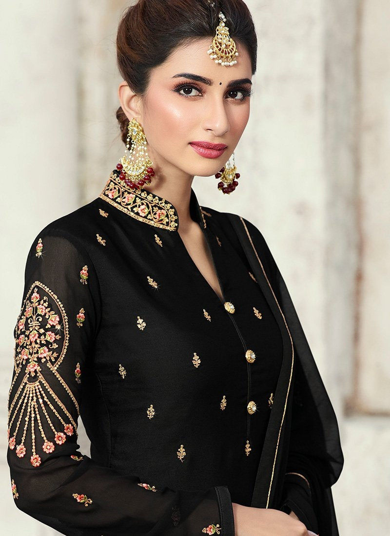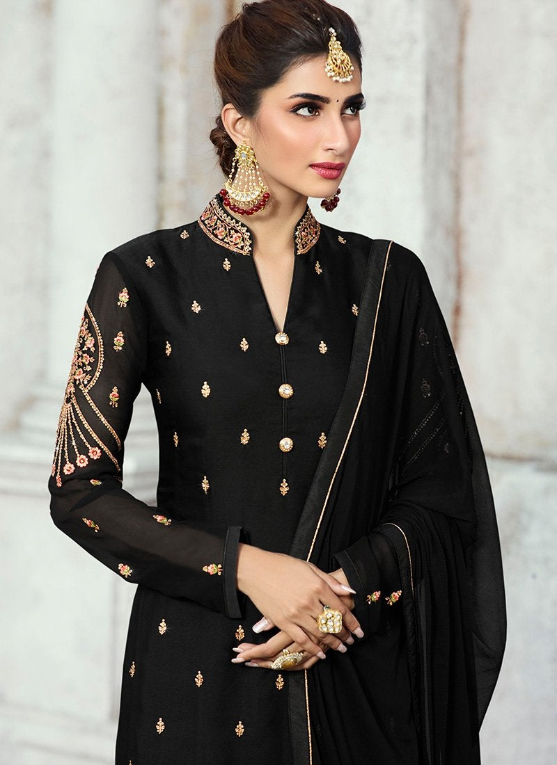 Black Embroidered Georgette Palazzo Suit will mesmerise rest of the crowd with your ethereal ethnic glow by wearing this set with beautiful top fully embellished with zari buttis and resham kari embroidery work on satin georgette fabric paired with designer embroidered georgette flared gharara bottom with added santoon lining and zari lace and satin detailed net dupatta. This set can be teamed up with a pair of golden heels and traditional jhumkas.