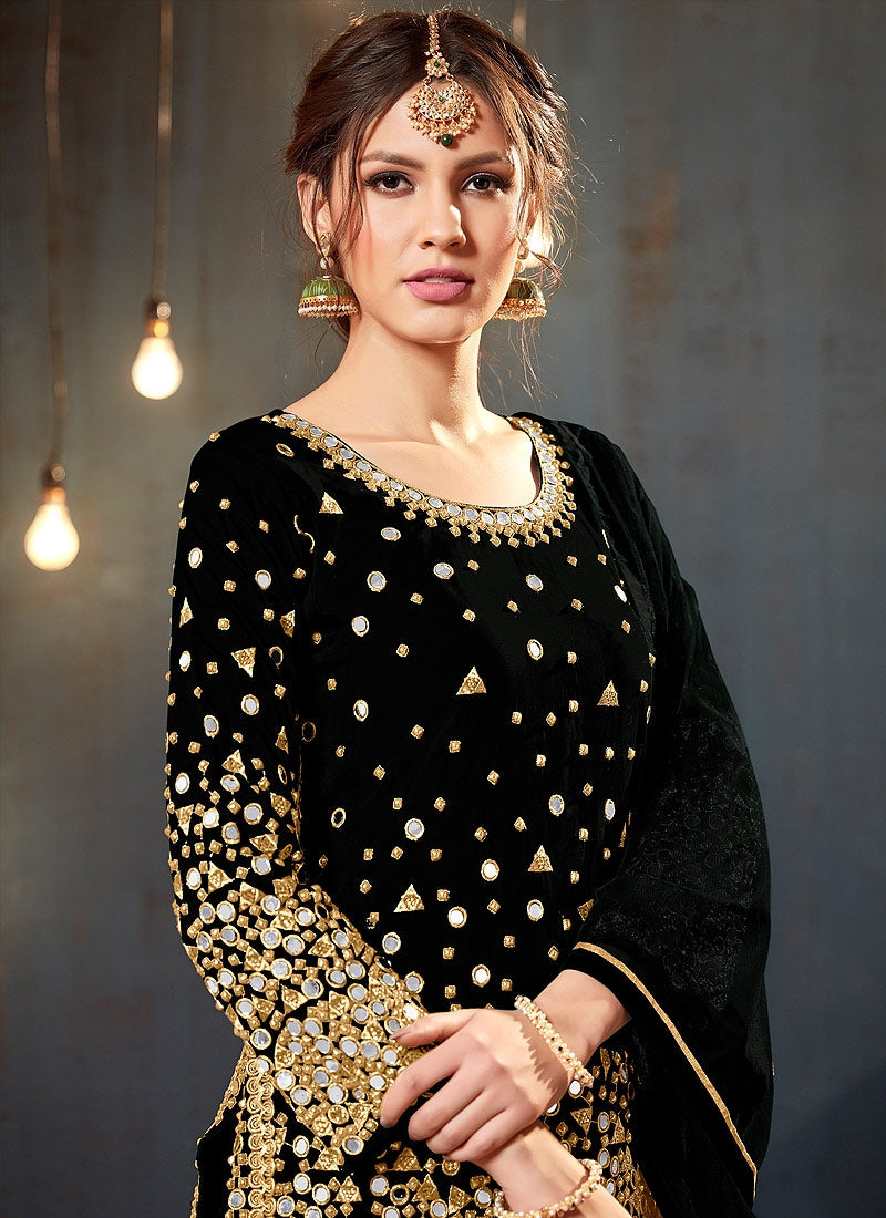 Black Embroidered Traditional Patiala Suit will mesmerise rest of the crowd with your ethnic glow by wearing this set with top fully embellished with zari buttis and stone work on rangoli silk fabric paired with matching santoon semi patiala bottom and embellished nazmine chiffon dupatta. This set can be teamed up with a pair of golden sandals and traditional jhumkas.