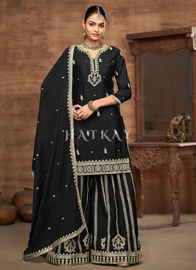 Black Embroidery Style Suit features classic look for this festive season with all the ethnic hues of reshamkari zari and sequins embroidery in straight cut chinnon mid length top paired with heavy ghera embellished chinnon palazzo bottom with santoon lining. The unique part is it’s embroidery border and butti enhanced chinnon dupatta. Wear this set with a pair of heels and golden jewellery to have a desi girl look.