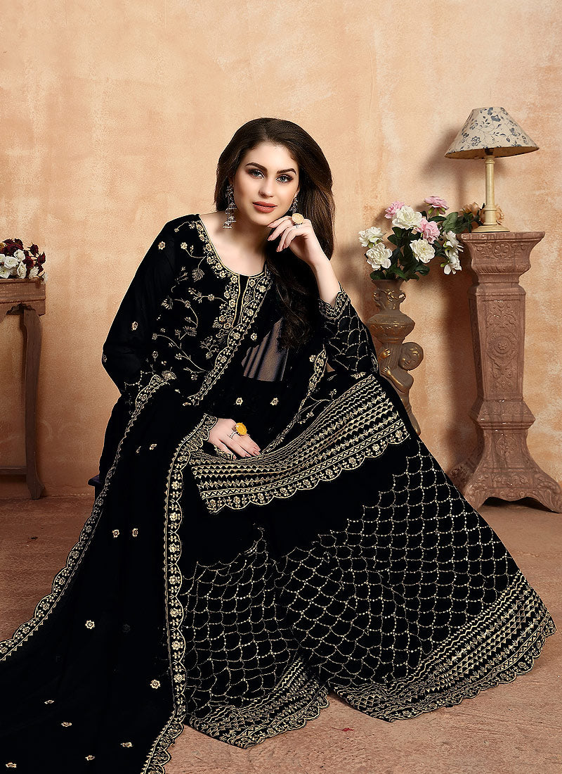 Black Golden Designer Sharara Suit In usa uk canada. Shop Latest Indian Clothes Collection Of Black Golden Designer Sharara Suit Online In Australia, Newzeland. This elegant set is curated with designer resham thread and stone embroidery on faux georgette kurta with traditional motifs paired with free sized equally fascinating embroidered georgette sharara bottom with santoon lining for top and bottom and faux georgette butti embroidered dupatta. Team this suit with basic heels and golden jewellery to have a graceful look.