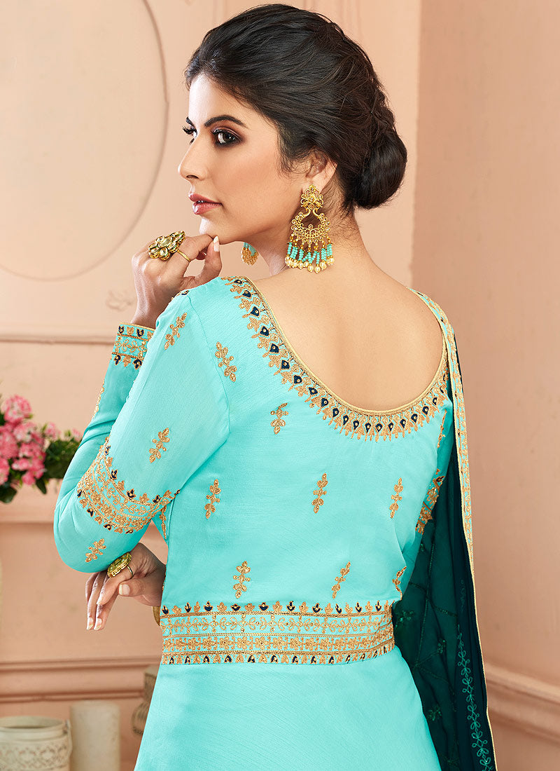 Blue And Green Traditional Anarkali Suit is designed for festive occasions or indian wedding. This set features traditional embroidery work with zari, thread and stone detail on its tussar silk anarkali top paired with santoon bottom and inner and embroidery detailed soft georgette dupatta. Team it up with golden jewellery and fancy clutch to look mesmerising.