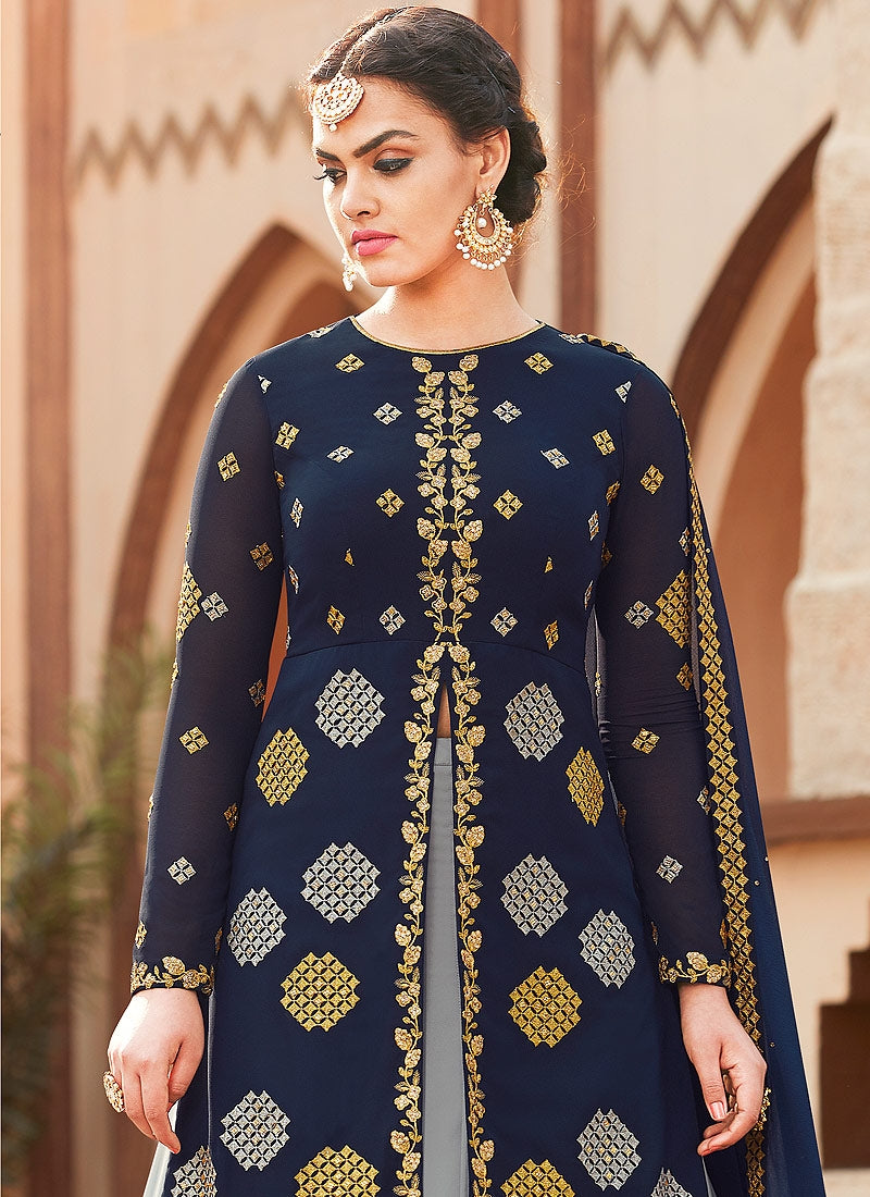 Blue And Grey Embroidered Lehenga Kurti Suit is especially crafted for showcasing glamorous style and ethnic elegance with its unique embroidered combination of zari and resham thread work annotated perfectly on straight cut georgette top with santoon lining and flared zari detailed georgette lehenga paired with bordered chiffon dupatta. Style it gracefully with studded earrings and stylish heels.