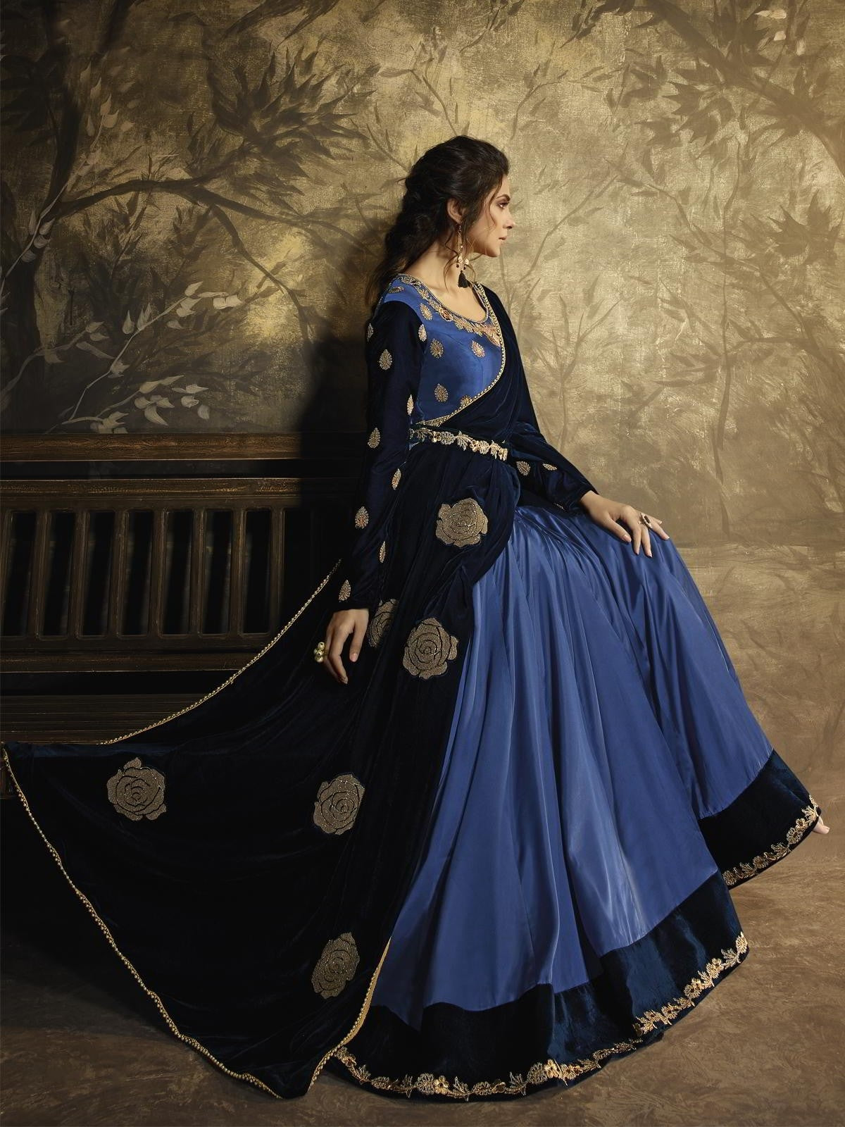Blue And Navy Satin Silk Embroidered Anarkali Suit