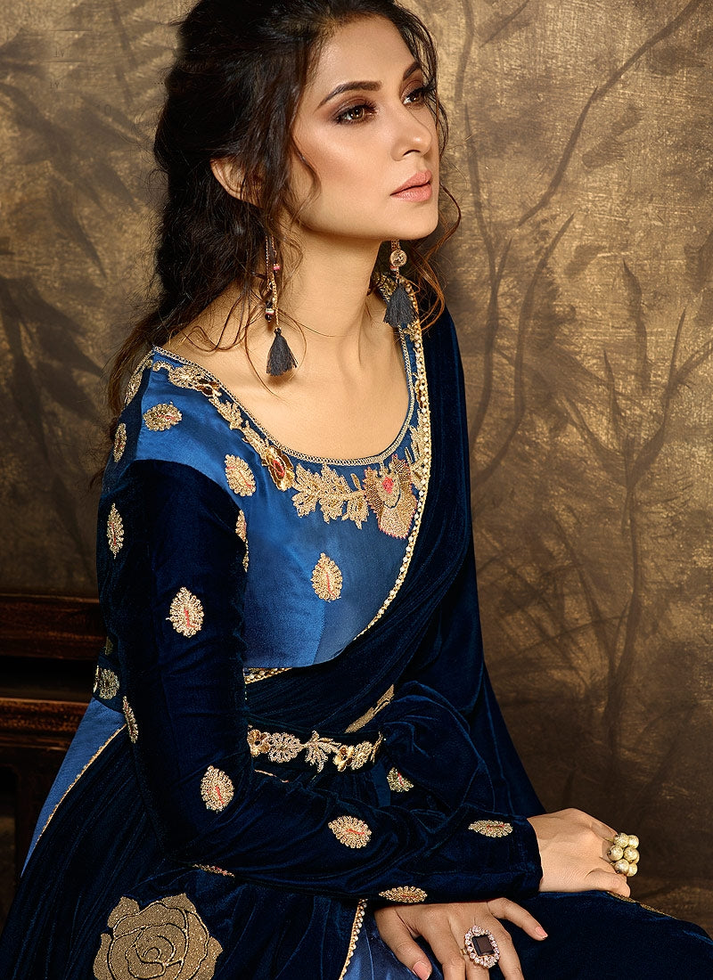 Blue And Navy Satin Silk Embroidered Anarkali Suit features very intrinsic embroidery over its satin silk flared anarkali top with contrast embellished daman paired with santoon bottom and zari detailed velvet dupatta. Embroidery work is completed with cording zari and thread detail. Wear this to bright up your wedding parties or any social event with heels and jewellery to look best from rest of the crowd.