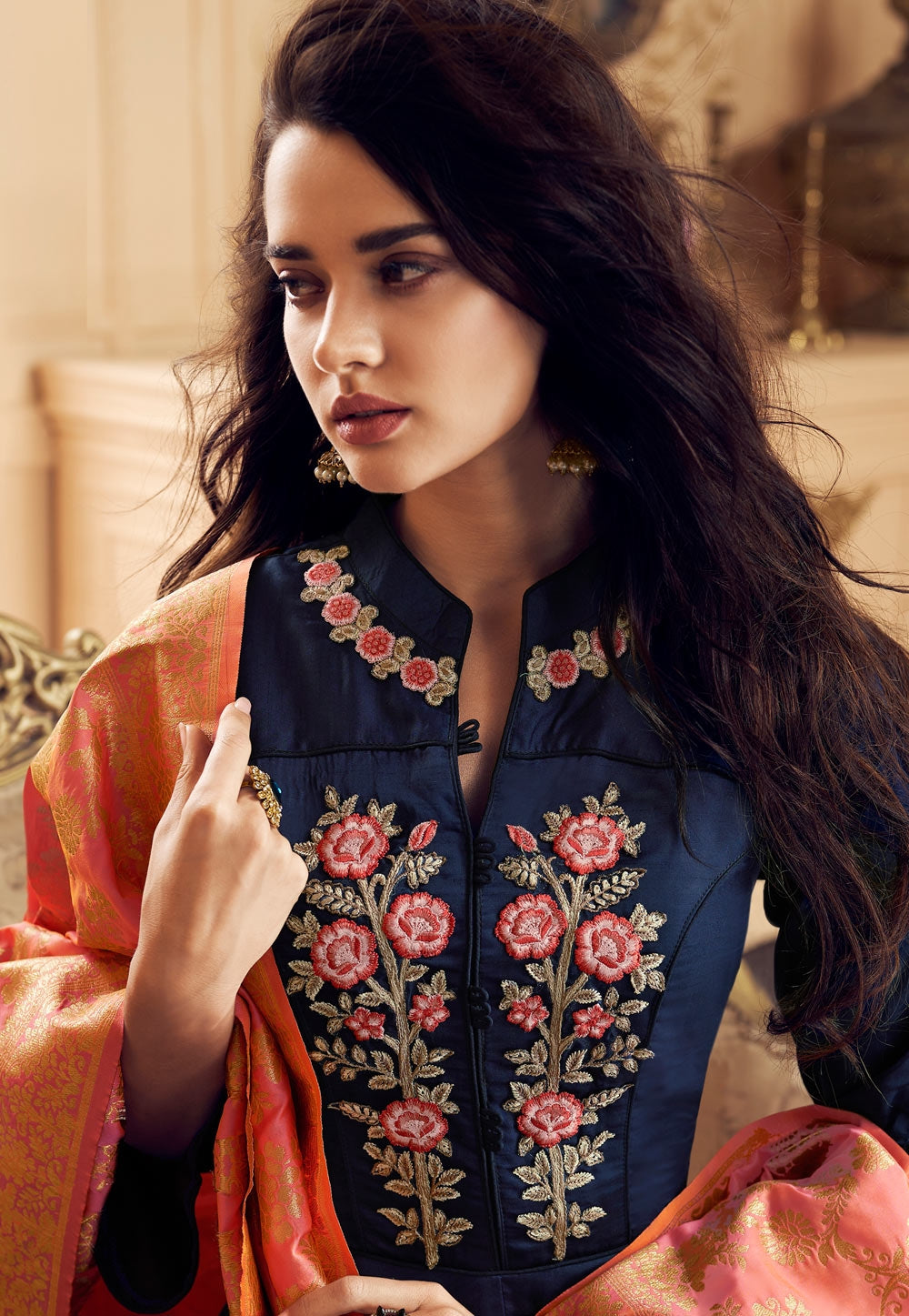 Blue And Orange Embroidered Satin Anarkali Suit is specifically designed to make you look perfect for wedding event or any festive occasions. This elegant set comprises a satin silk anarkali with neckline and yoke detailed with minimal traditional motifs of digital zari and thread embroidery paired with cotton bottom, crape lining and an extraordinary banarasi jacquard dupatta. Team this suit with golden heels and matching accessories to have a graceful look.