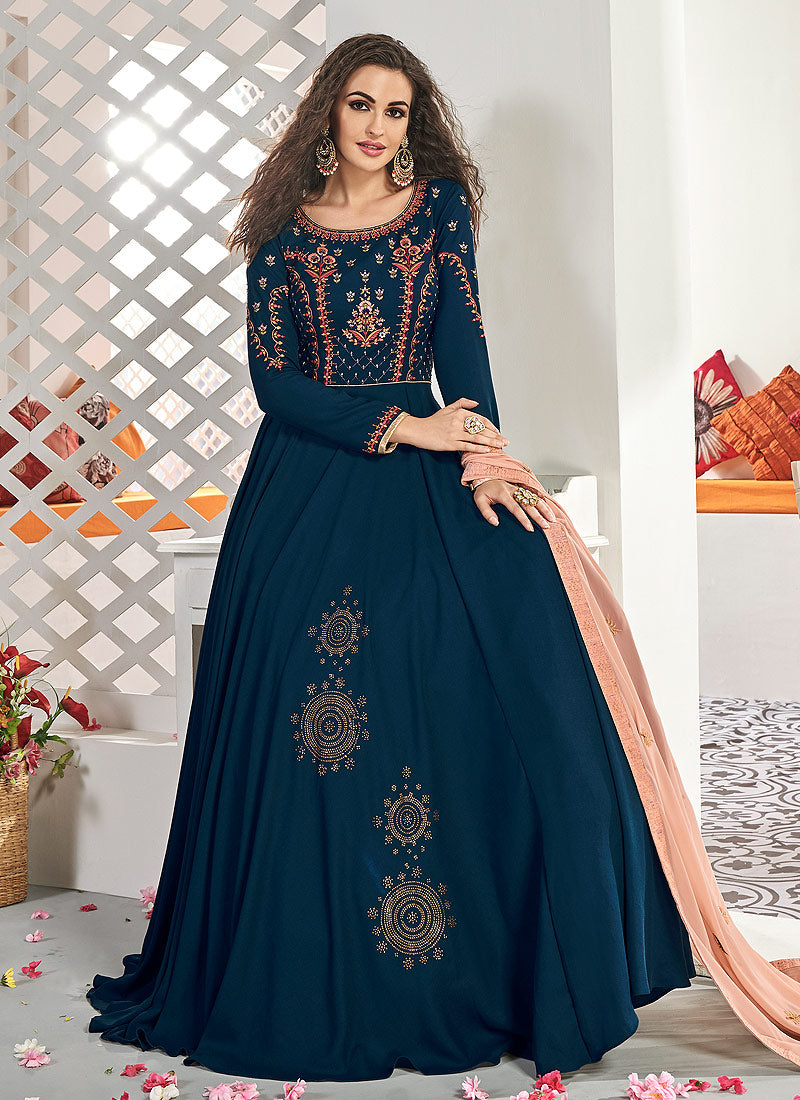 Blue And Peach Traditional Embroidered Anarkali Suit is indian wear designed for festival or wedding parties. This outfit features traditional embroidery work with zari, thread and stone detail on viscose silk anarkali top paired with santoon bottom and crape inner. The beauty part is it’s minimalist embroidered georgette dupatta. This set will surely fetch you compliments for you glamorous sense of style. Team it up with golden jewellery and fancy clutch to look mesmerising.