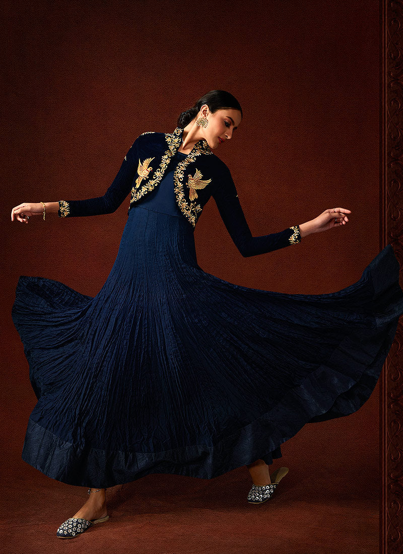 Blue Designer Anarkali Gown Suit is designed for festive occasion or wedding parties. This set features intricate floral embroidery work with zari, thread and stone detail on its velvet jacket style satin anarkali gown paired with silk bottom and chiffon dupatta. This designer attire will surely fetch you compliments for you glamorous sense of style. Team it up with golden jewellery and fancy clutch to look mesmerising.