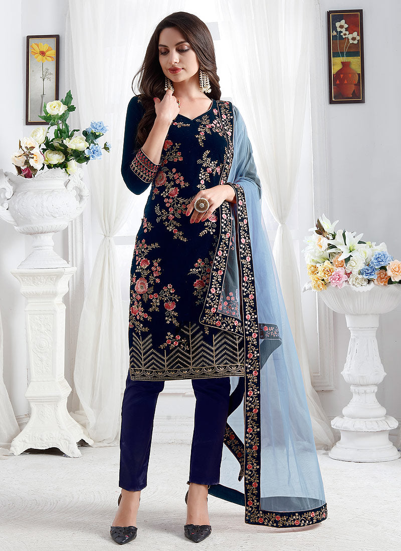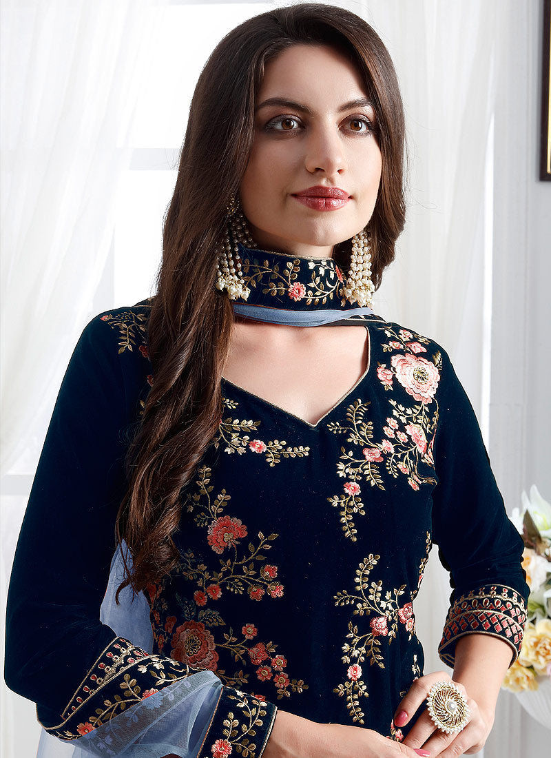 Blue Embroidered Designer Pant Suit is indian outfit with traditional zari and resham thread embroidery over its soft velvet top paired with matching santoon pants bottom. The dress accompanies with exclusively golden zari embroidered net dupatta. Wear this to bright up your wedding parties or any social event with heels and golden jewellery to look best from rest of the crowd.