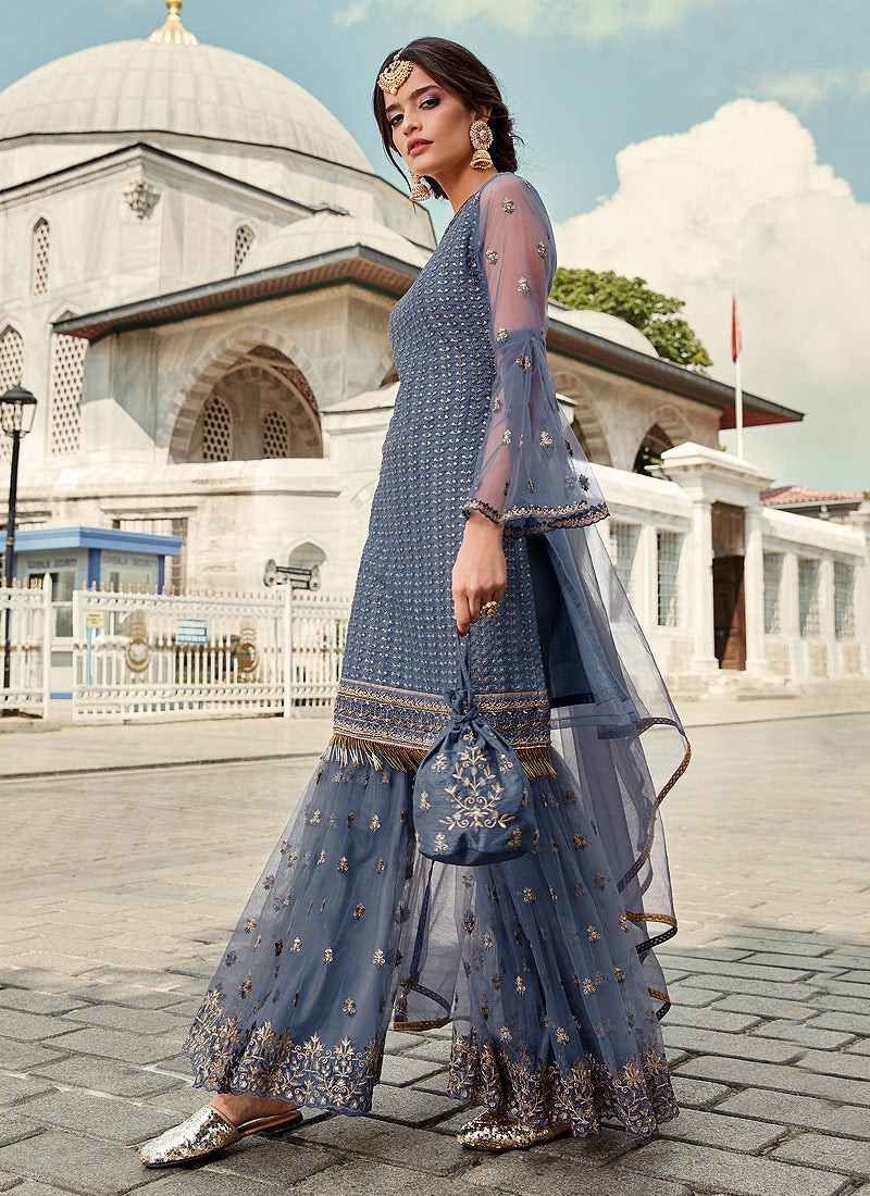 Blue Designer Gharara Suit In usa uk canada Shop Latest Indian Clothes Collection Of Blue Designer Gharara Suit Online In Australia, Newzeland. This suit set comprises a beautiful traditional zari, sequence and thread embroidered straight cut net with santoon lining top paired with net embellished gharara bottom and shimmering lace bordered net dupatta. This suit set will go well with golden jewellery and heels.