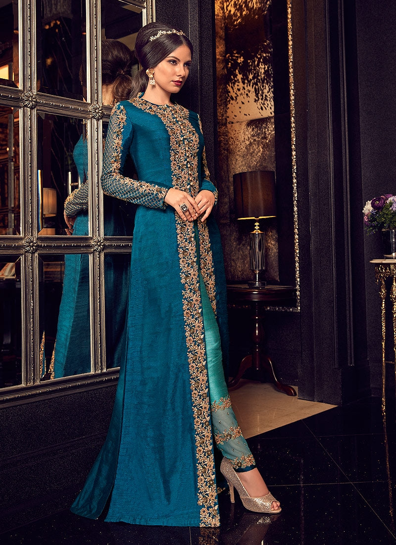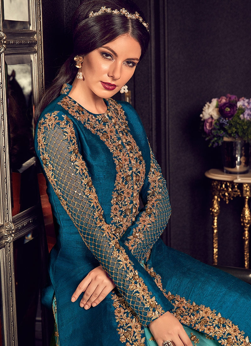 Blue In Dual Tone Traditional Embroidered Anarkali Suit is specifically designed to make you look perfect as a bride and bridesmaids. This suit set features thread, zari and resham traditional embroidered detail on tussar silk jacket style top paired with shimmering banarasi silk bottom and embellished net dupatta. Team this suit with stilettos and statement jewellery to complete your look.