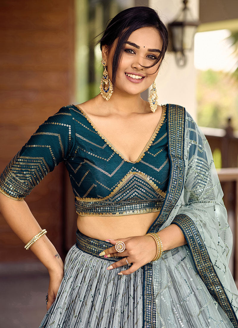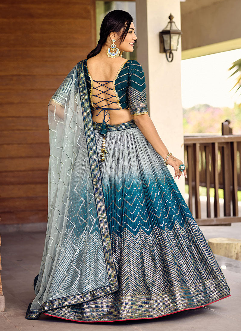 Blue Ombré Sequence And Thread Embroidery Wedding Lehenga is best pick as an indian wear for festive or wedding event. This elegant set is enhanced with sequence and resham thread work embroidery on ombré crinkled chinnon lehenga with satin lining paired with equally embellished matching chinnon silk choli top. The beauty of this set is sequence embroidered soft net dupatta and waist belt. Team this beautiful attire with classic pair of heels and statement jewellery to look like a diva.