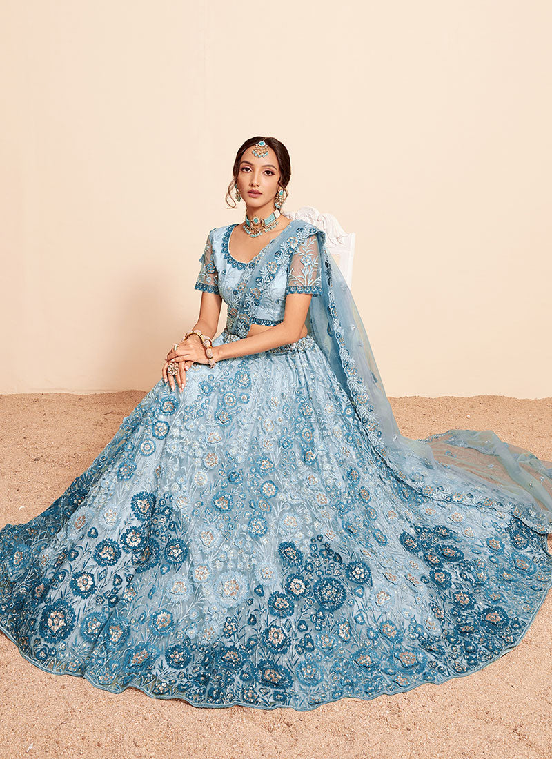 Blue Ombré Thread And Sequence Embroidery Lehenga Choli With Dupatta is best pick as an indian wear for festive or wedding event. This elegant set has a very pretty appliqué embroidery detailed with resham thread, zarkan, beads and sequence work on canned net lehenga with satin lining paired with equally embellished matching net choli top and ethnic motifs and border embroidered soft net dupatta. Team this beautiful attire with classic pair of heels and golden jewellery to look like a diva.
