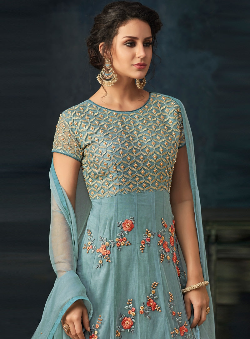 Blue Overall Bunch Embroidered Flared Anarkali Suit