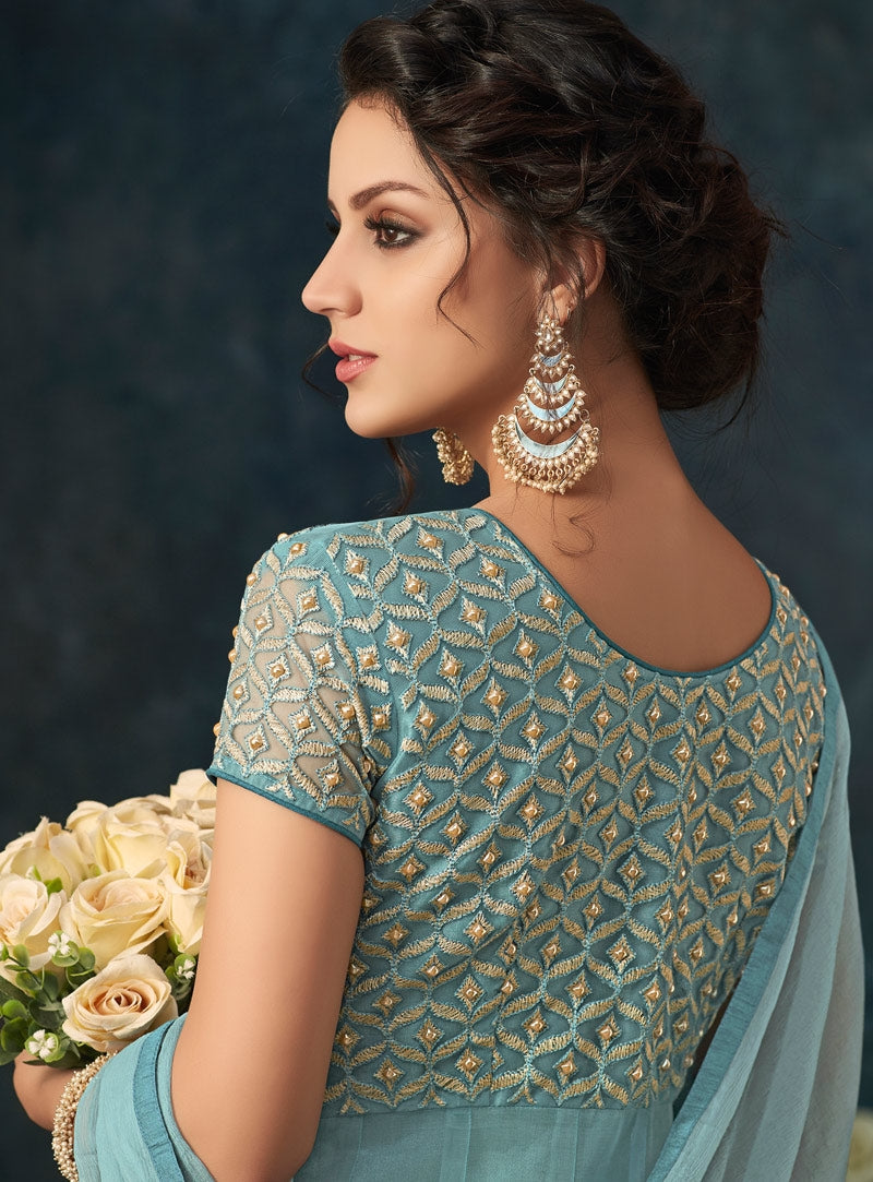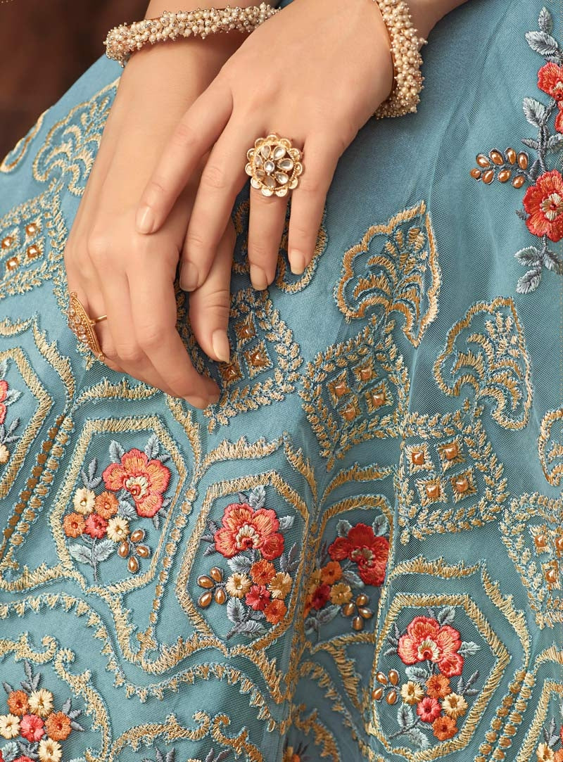 Blue Overall Bunch Embroidered Flared Anarkali Suit will indulge you to look more beautiful on this wedding season with its alluring beauty. This set comprises of floral zari and resham-kari embroidered flared fancy net top paired with matching santoon bottom and lining and stone studded chiffon dupatta. Style this set with juttis and fashion jewellery to look stunning with all bridal drama.
