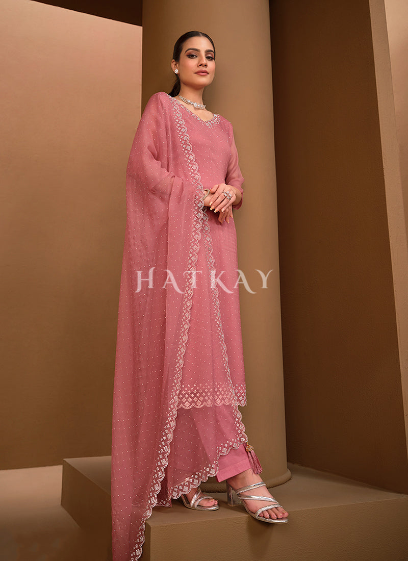 Blush Pink Crystal Embroidered Pant Style Suit Designed for woman who values tradition and luxury, this ensemble is adorned with sparkling swarovski crystal detailing on a rich organza chiffon fabric. Paired with santoon pants and an inner lining, the set is completed with a breathtaking organza chiffon dupatta featuring a cutwork border and shimmering crystal embellishments. Perfect for making a statement at weddings and festive celebrations, this outfit exudes elegance and sophistication.