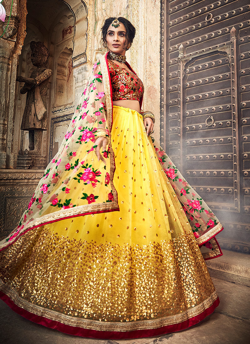 Yellow And Red Lehenga Choli In usa uk canada. Shop Latest Indian Clothes Collection Of Yellow And Red Lehenga Choli Online In Australia, Newzeland. This elegant set has a very pretty thread embroidery detailed with zarkan, zari and sequence work on soft net lehenga with satin lining paired with equally embellished soft net choli and ethnic embroidery bordered net dupatta. Team this beautiful attire with classic pair of heels and golden jewellery to look like a diva.