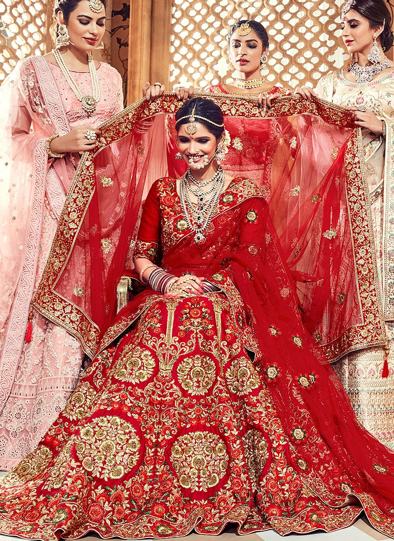 Bridal Red Velvet Hand Embroidered Lehenga Choli Set will indulge you to look more beautiful on this wedding season with its classic combination and design. This set comprises of modern kashmiri and resham-kari embroidered choli top made on satin fabric paired with matching velvet fully embellished lehenga and minimalist embroidered net dupatta. Style this set with stilettos and fashion jewellery to look stunning with all bridal drama.