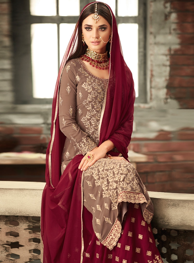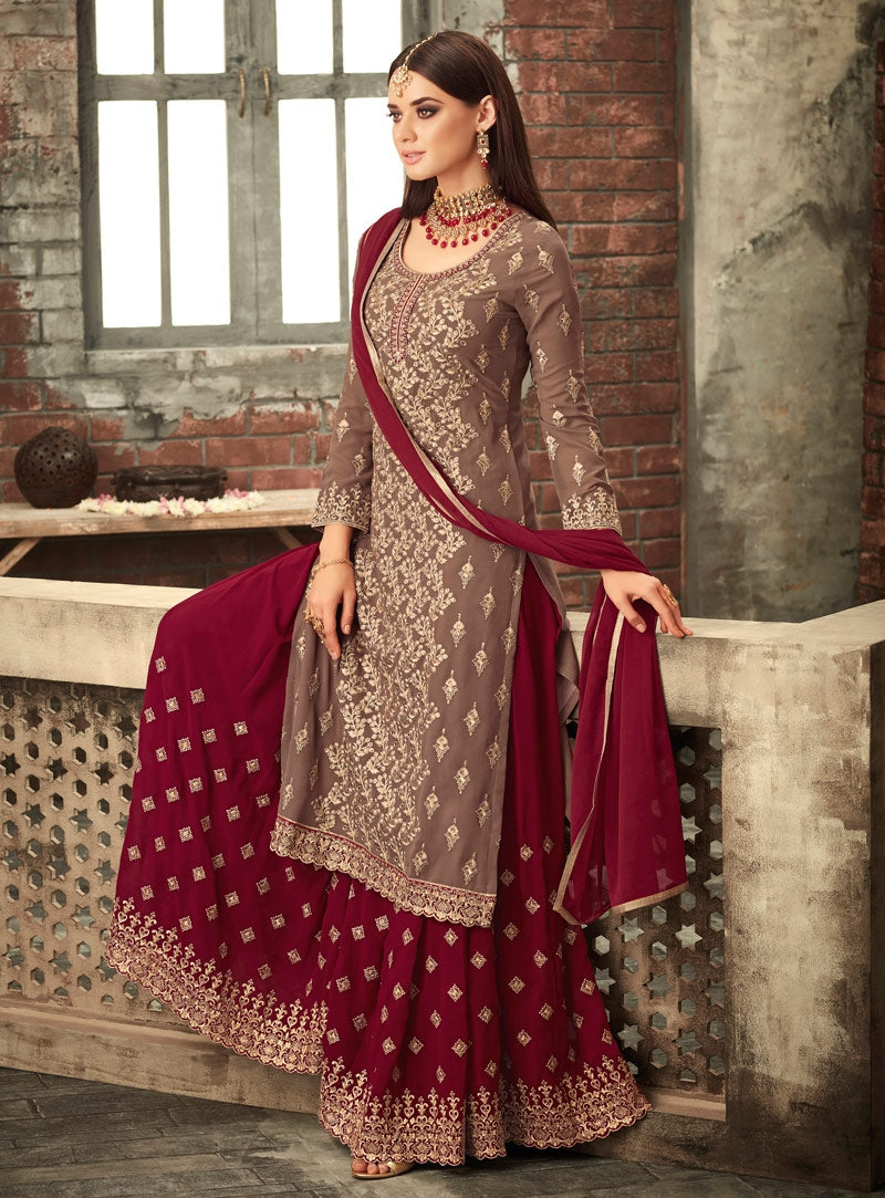 Brown And Red Traditional Embroidered Palazzo Suit is feminine, appealing and excellent pick for any festival and on wedding function. This elegant set comprises a georgette with santoon lining kurta with all over embroidery detailed with minimal motifs of zari, thread and sequence work, a pair of georgette embellished palazzo bottom and chiffon bordered dupatta. Team this suit with beige heels and matching accessories to have a graceful look.