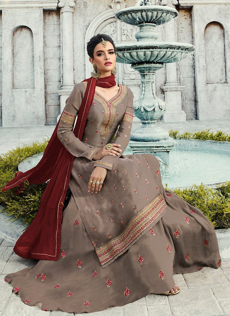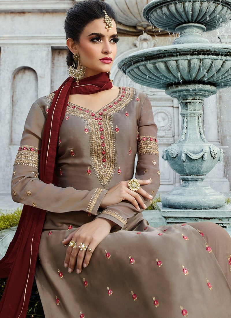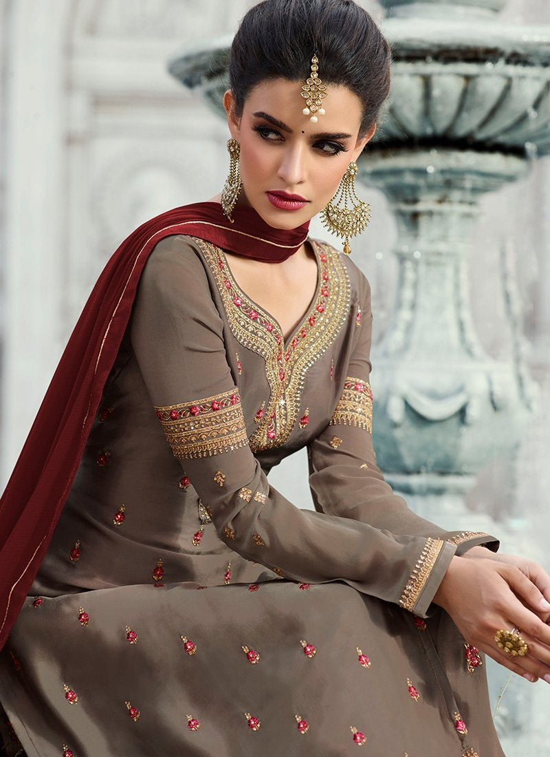 Brown Embroidered Georgette Palazzo Suit will mesmerise rest of the crowd with your ethereal ethnic glow by wearing this set with beautiful top fully embellished with zari buttis and resham kari embroidery work on satin georgette fabric paired with designer embroidered georgette flared gharara bottom with added santoon lining and zari lace and satin detailed net dupatta. This set can be teamed up with a pair of golden heels and traditional jhumkas.