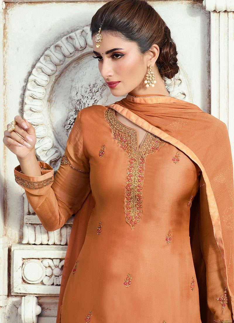 Burnt Orange Embroidered Georgette Palazzo Suit will mesmerise rest of the crowd with your ethereal ethnic glow by wearing this set with beautiful top fully embellished with zari buttis and resham kari embroidery work on satin georgette fabric paired with designer embroidered georgette flared gharara bottom with added santoon lining and zari lace and satin detailed net dupatta. This set can be teamed up with a pair of golden heels and traditional jhumkas.