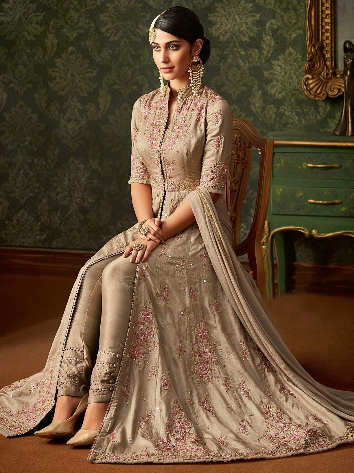 Copper Beige Front Slit Embroidered Anarkali Pant Suit