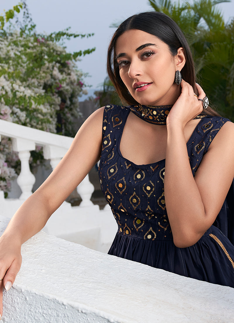 Dark Blue Zari And Sequence Embroidery High Slit Anarkali Suit