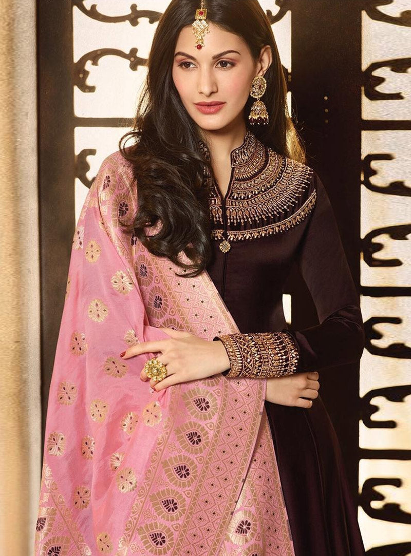 Dark Brown And Pink Motif Embroidered Ghera Anarkali Suit is especially crafted for showcasing glamorous style and ethnic elegance with its unique motifs embroidered combination of beautiful zari and thread work annotated perfectly on flared satin georgette anarkali top with border detail. This set accompanies with santoon bottom and digital printed banasi jacquard dupatta. Style it gracefully with studded earrings and stylish heels on this festive season.
