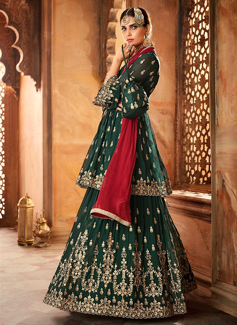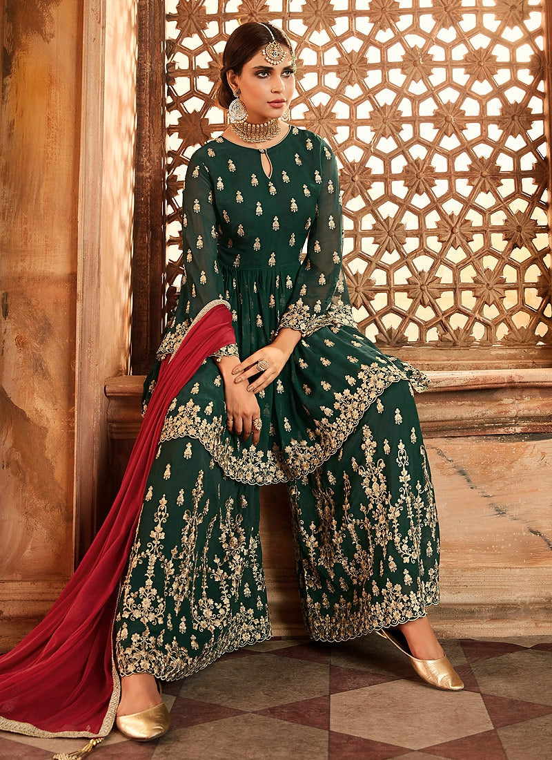 Dark Green And Red Embroidered Peplum Style Gharara Suit is specially designed to complement your alluring beauty. This suit set comprises a beautiful traditional zari and thread embroidered peplum style georgette with santoon lining top paired with georgette gharara bottom and shimmering contrast chiffon dupatta. This suit set will go well with golden jewellery and heels.