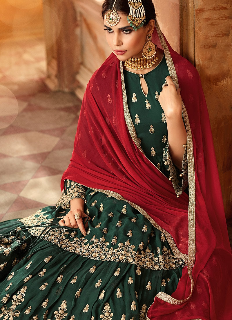Dark Green And Red Embroidered Peplum Style Gharara Suit