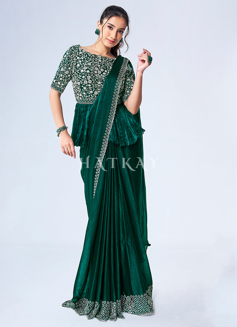 Dark Green Embroidery Wedding Saree features ethnic essence with modern touch. This saree is embedded perfectly with resham thread, zari, sequence and beads work embroidery detailed over pallu and daman on premium chiffon saree paired with equally embellished shimmering silk peplum style blouse. Drape this fancy saree on fesitive parties or on wedding event with heels and statement jewellery to look like a diva.