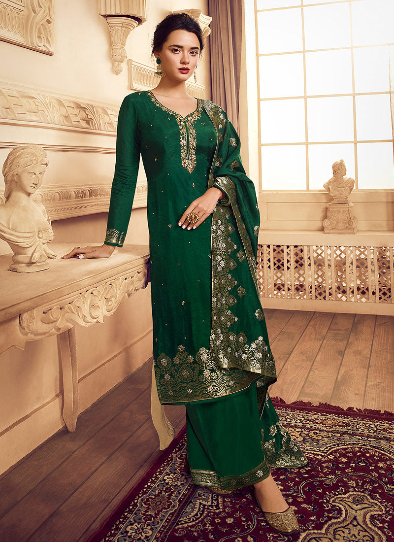 Dark Green Golden Embroidered Designer Palazzo Suit
