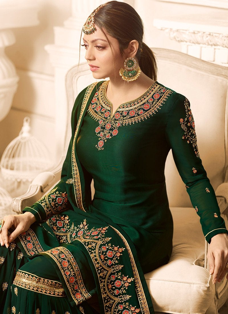 Dark Green Embroidered Designer Gharara Palazzo Suit will mesmerise rest of the crowd with your ethereal ethnic glow on this diwali festival or on wedding event by wearing this set with beautiful top fully embellished with zari buttis and resham embroidery work on satin georgette fabric paired with matching georgette gharara palazzo bottom and detailed georgette dupatta. This set can be teamed up with a pair of golden juttis and traditional jhumkas.